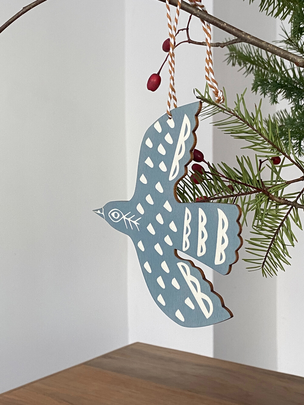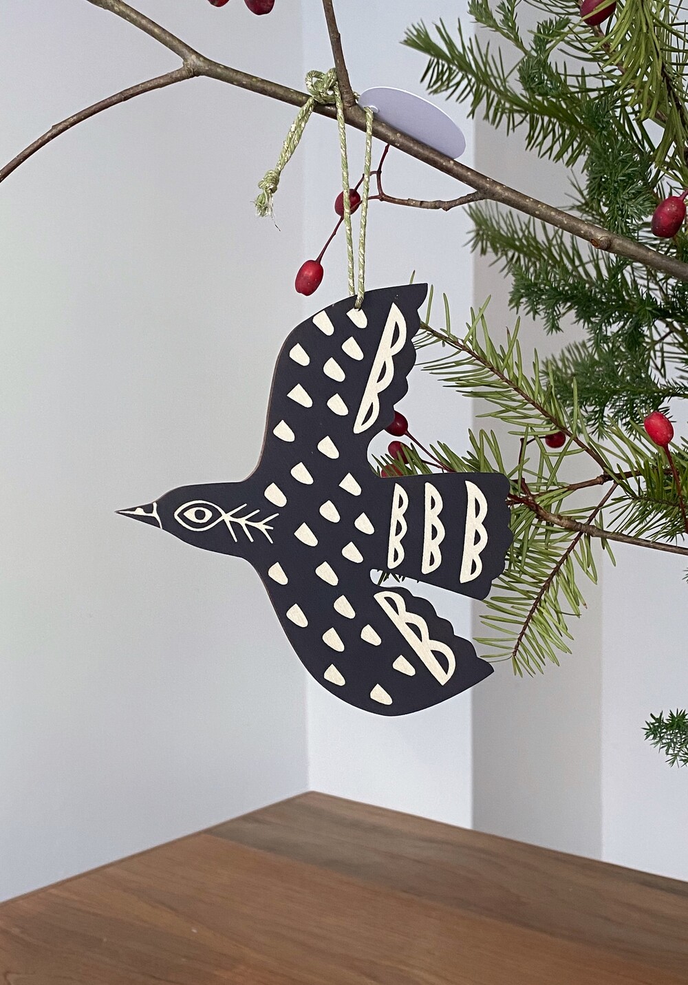 세가지 컬러로 양면 리노컷 프린트 (판화기법)된 Black Bird 오너먼트에요.